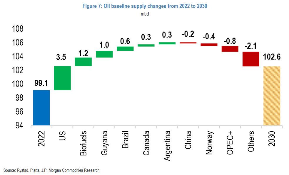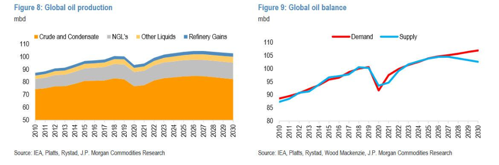 供应方面,摩根大通的基准假设是,到2027年,全球石油供应量将从2022年的9910万桶/日增加至1.045亿桶/日,然后到2030年回落至1.026亿桶/日。