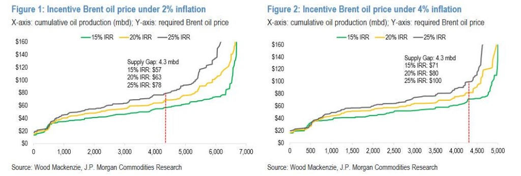 根据摩根大通估算,假设通胀率为2%,基于20%的IRR,布伦特原油激励价格下限约为63美元/桶;在通胀率不变、IRR升至25%的假设下,激励价格将升至78美元/桶。